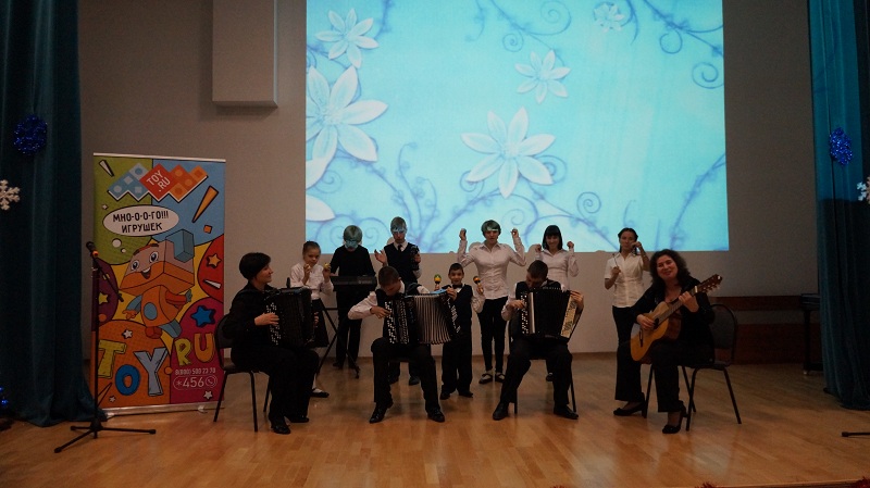 В фойе ребята, вволю наигравшись с мыльными пузырями, сделали своими руками елочные украшения из бумаги и картона, а также куклы-обереги из ниток «Снегурочка». После этого начался праздничный концерт.