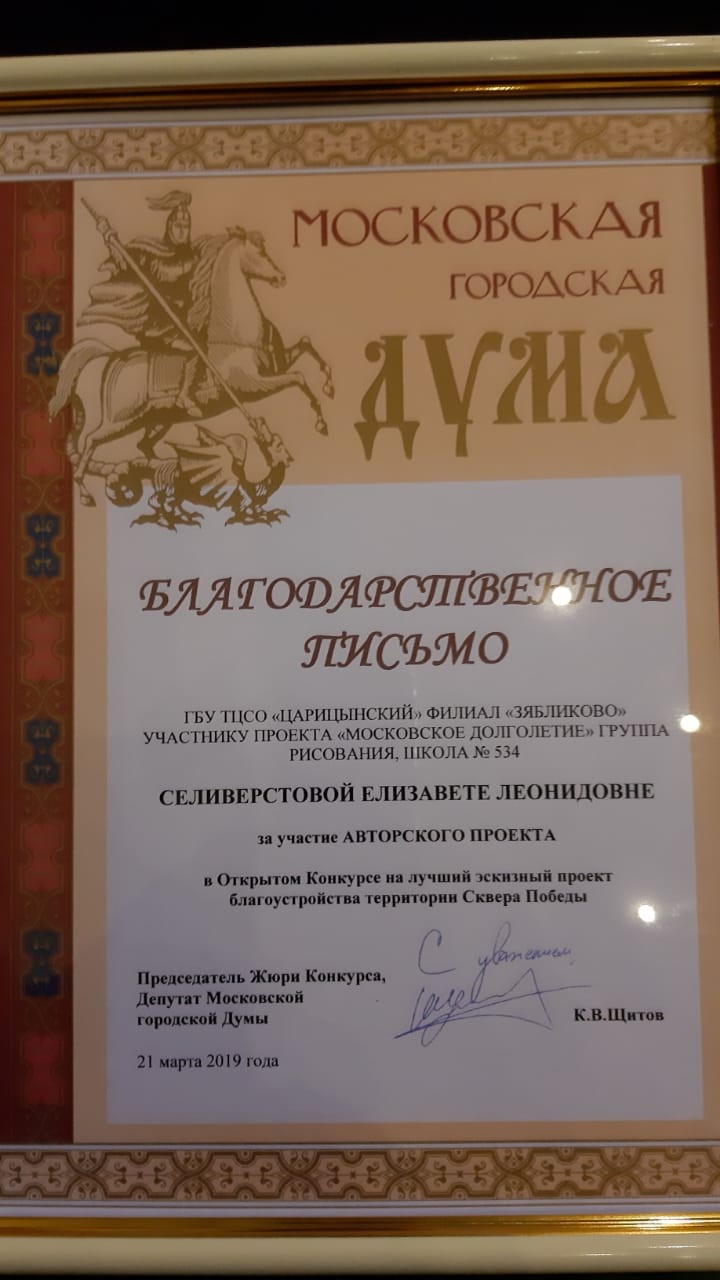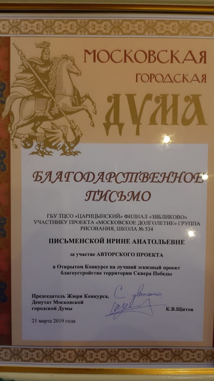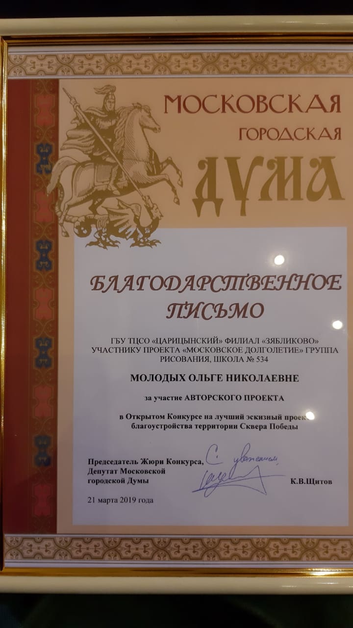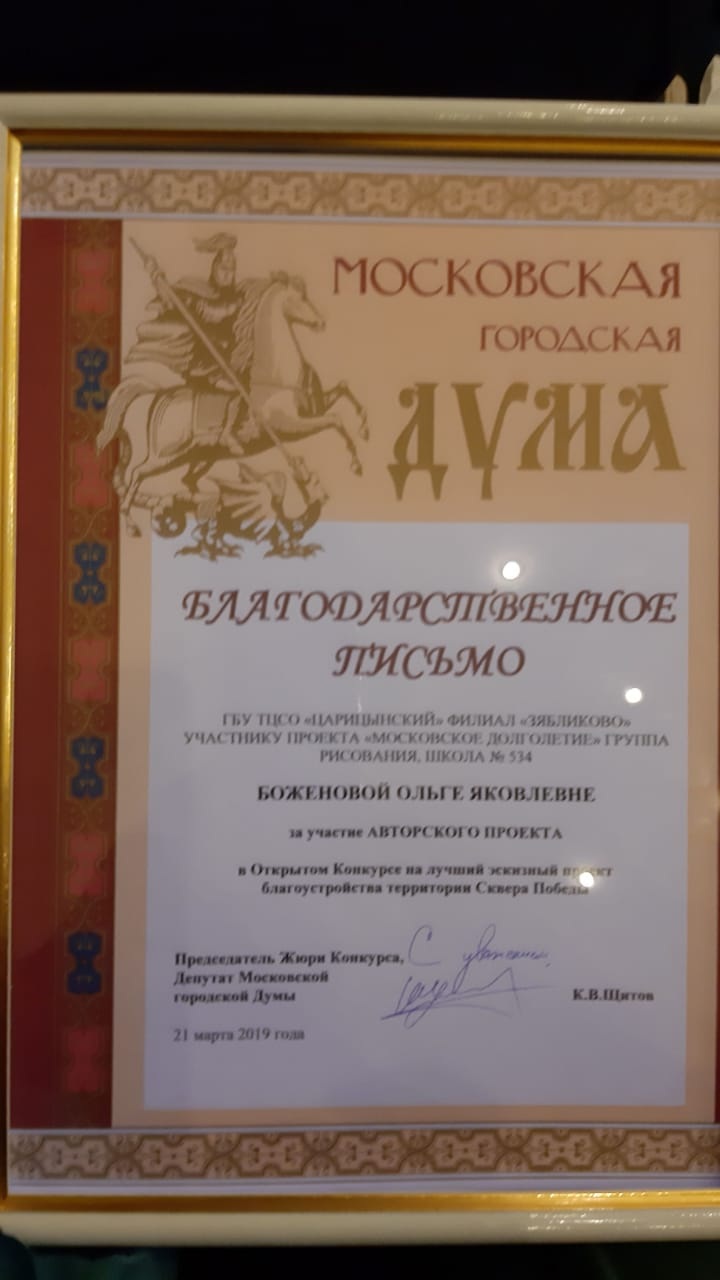 Пять участниц проекта «Московское долголетие» получили благодарственные письма за работы, представленные на районном конкурсе, посвященном проекту «Сквера Победы». Редактору газеты «Новости Зябликово» удалось связаться с Людмилой Горюновой и Ольгой Молодых и узнать у них, каким они видят будущий парк.