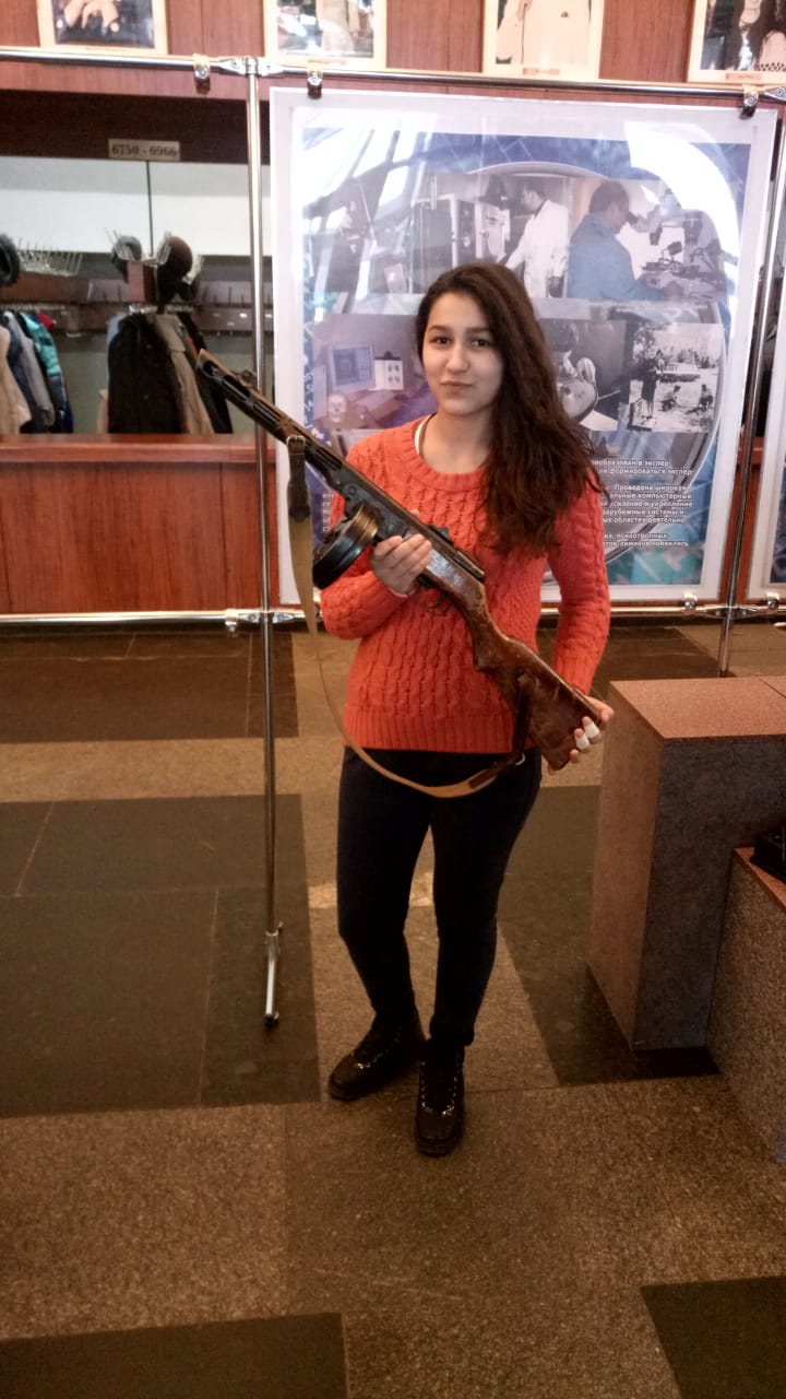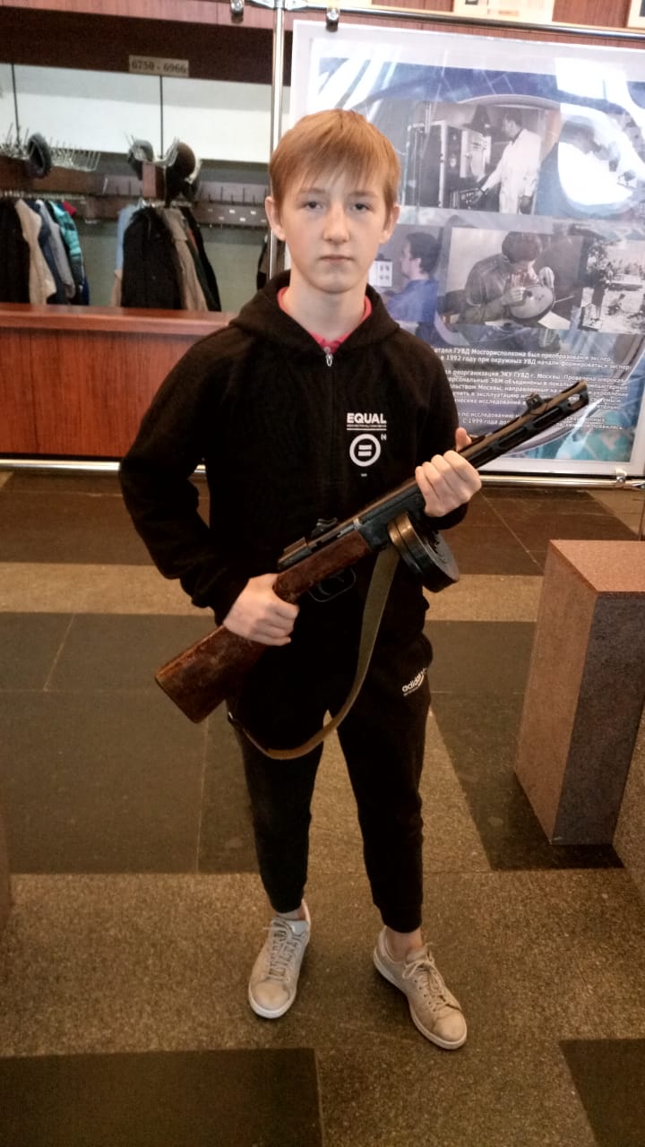 Кроме того, в холле ребята пообщались с сотрудником полиции, переодетым в форму времен Великой Отечественной войны. Он разрешил детям сфотографироваться с автоматом ППШ (пистолет-пулемет Шпагина — прим.ред.), который был частью его экипировки.