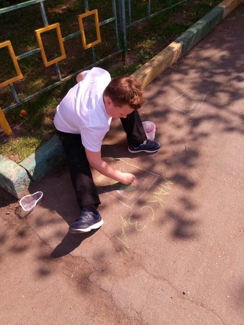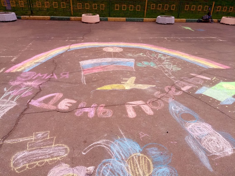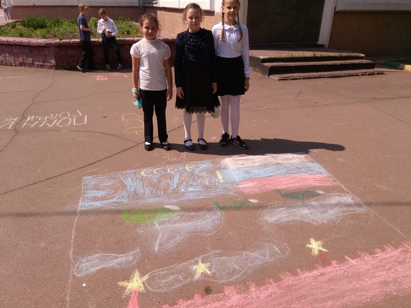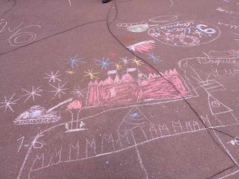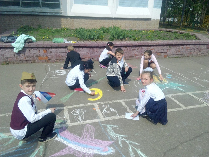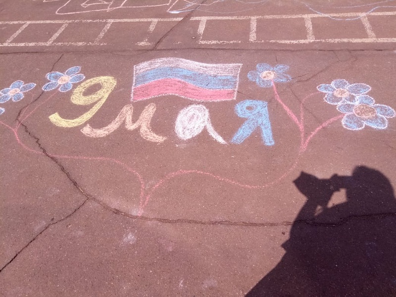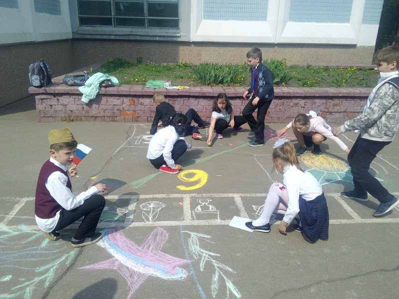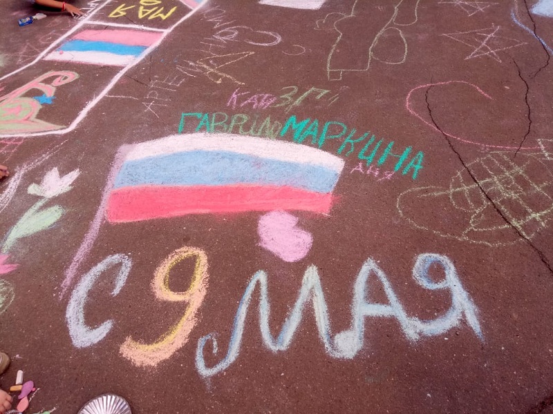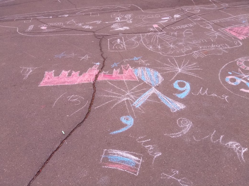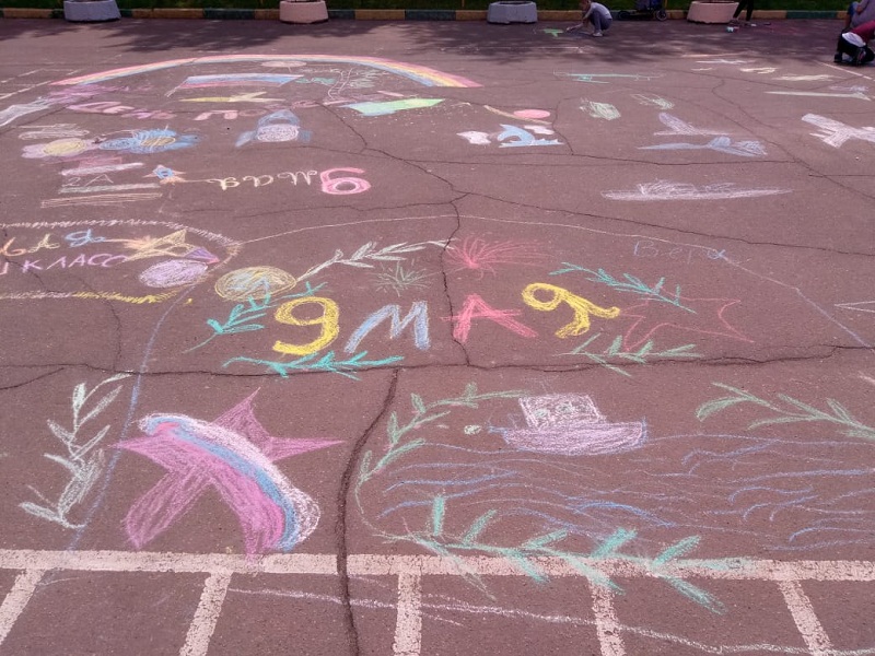 – Во дворе первого школьного отделения был проведен фестиваль рисунков на асфальте, посвященный 9 Мая. Команды младших классов рисовали мелками на данную тематику, – пояснила Анна Ильинична.
