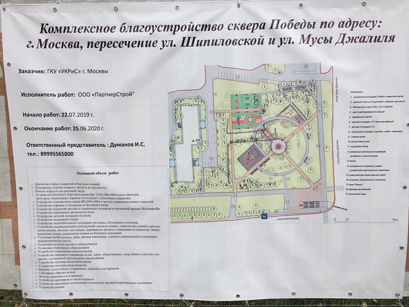 Напомним, что в настоящее время по программе благоустройства «Сквера Победы» ведется демонтаж старого покрытия дорожек и бортового камня у дома № 43 по Шипиловской улице. Для прохода местных жителей к одноименной станции метро организованы пути обхода и уложены специальные деревянные настилы.
