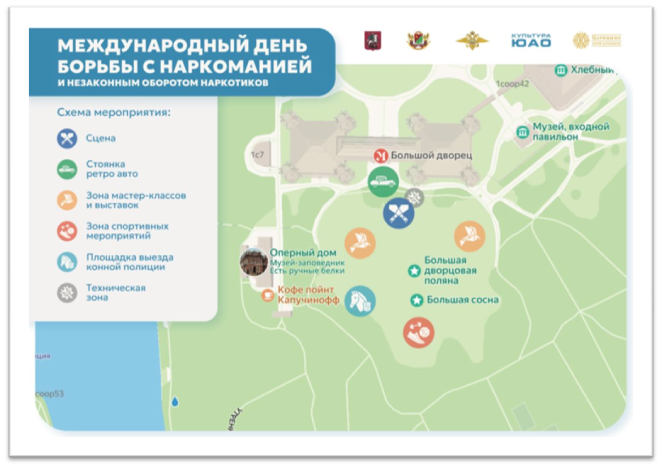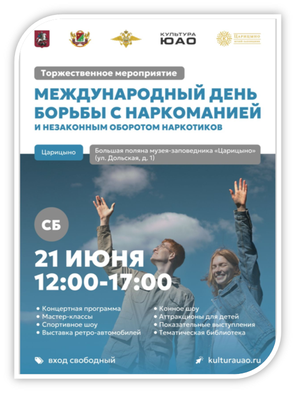21 июня 2025 года на территории ГМЗ «Царицыно» (на площадке «Большая поляна») Управлением по контролю за оборотом наркотиков ГУ МВД России по г.Москве, при поддержке Префектуры Южного административного округа г.Москвы и ГБУ г.Москвы «ЮГ СТОЛИЦЫ» запланировано проведение мероприятия, приуроченного к Международному дню борьбы с наркоманией.